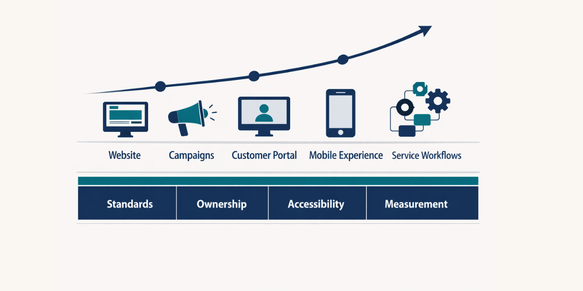 Growth exposes weaknesses that smaller organisations can temporarily ignore. A website that once felt “good enough” starts to fragment. New landing pages appear without consistency. Customer journeys diverge across channels. Accessibility becomes uneven. Internal teams make digital decisions in isolation. Over time, the business experiences the symptoms before it identifies the cause: lower conversion confidence, higher support friction, inconsistent brand perception, and slower digital delivery.